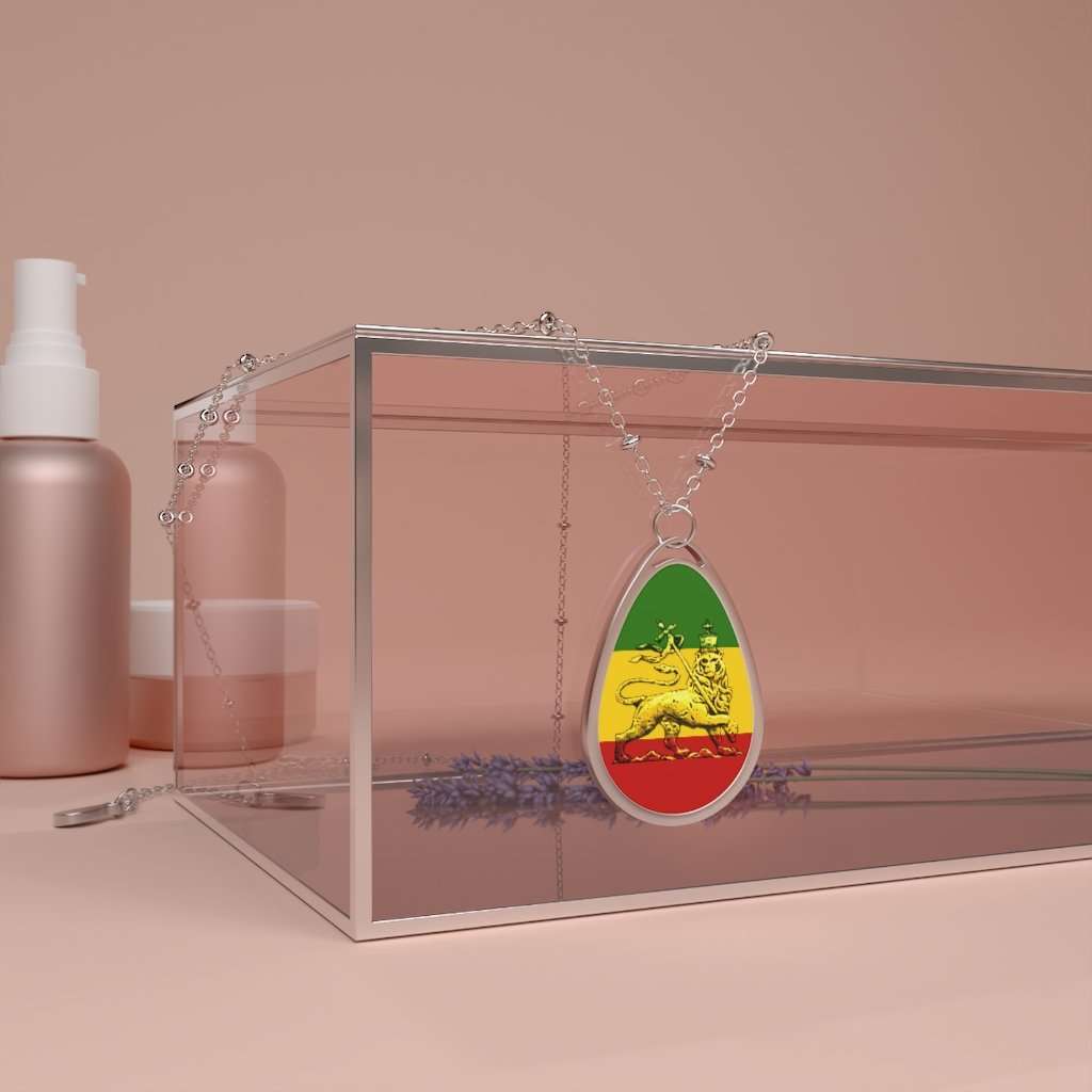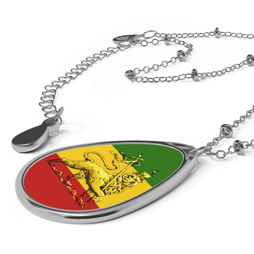 Lion of Judah Rastafarian Oval Necklace. The personalized pendant and its chain are made with robust zinc-alloy for dazzling looks that are long-lasting. The print panel is made with aluminum while the pendant itself comes in a unique shape of an ellipse.