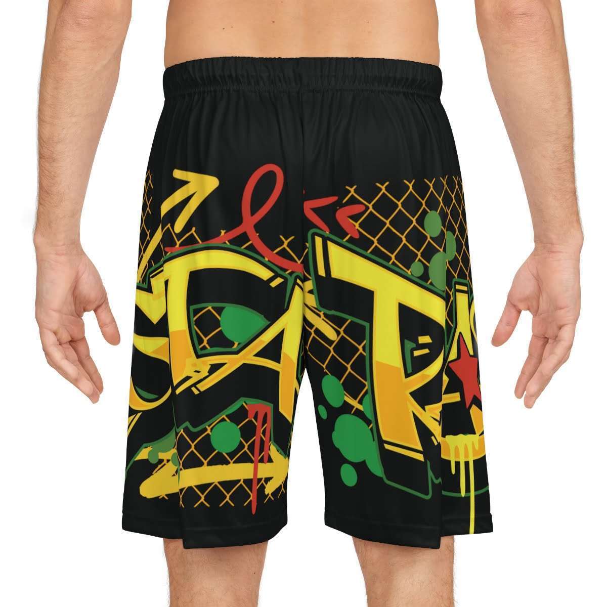 Rasta Graffiti dope basketball shorts. They're comfortable and adjustable with an elastic waistband and drawstring. You can print high-definition designs all over the moisture-wicking and odor-resistant fabric for full customization. Don't stop there. Pair it with a matching basketball jersey to be game-ready.