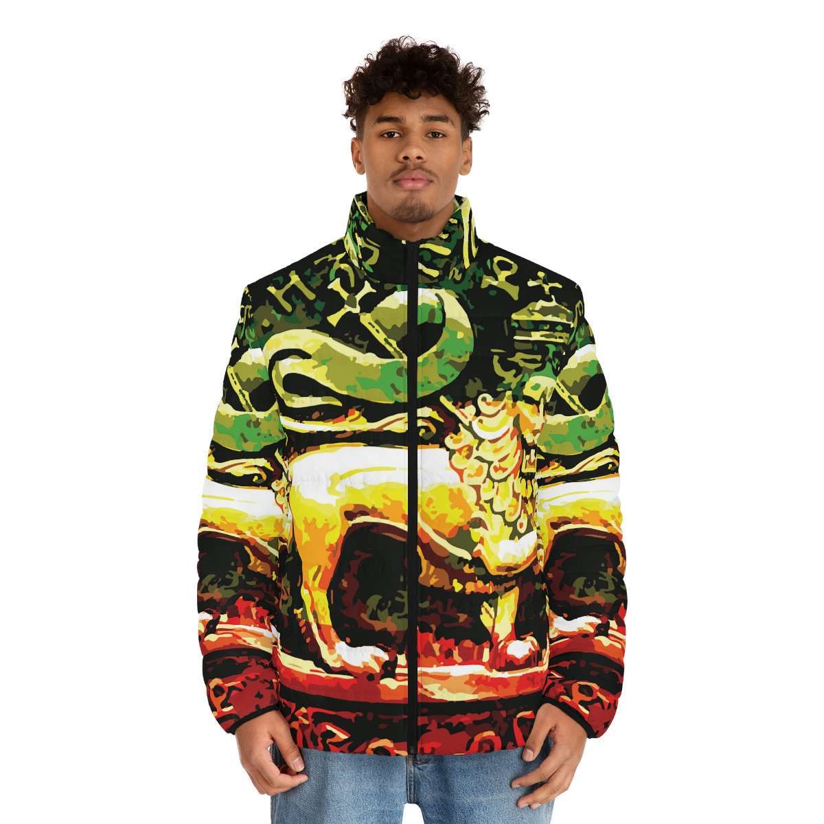 A custom Rasta abstract Lion of Judah puffer jacket is a grade-A upgrade to any wardrobe. This one comes with a stand-up collar, quilted lining, black cuff lining, and two spacious side pockets for added practicality. Each jacket is lightweight and super soft to the touch. Choose between two zipper color choices: black or dark blue.