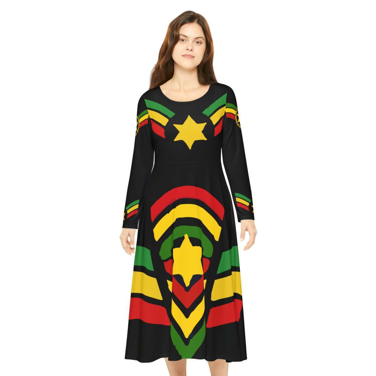 Jah Rastafari Reggae Dress with its polyester milk silk fabric blend, this dress is not only a soft bliss to wear but it's also highly breathable for when things get hot on the dance floor. Each dress comes with a regular fit, and a scoop-shaped, high-cut neckline which adds a classy touch. Rasta military stars and stripes in red gold and green with Lion of Judah.